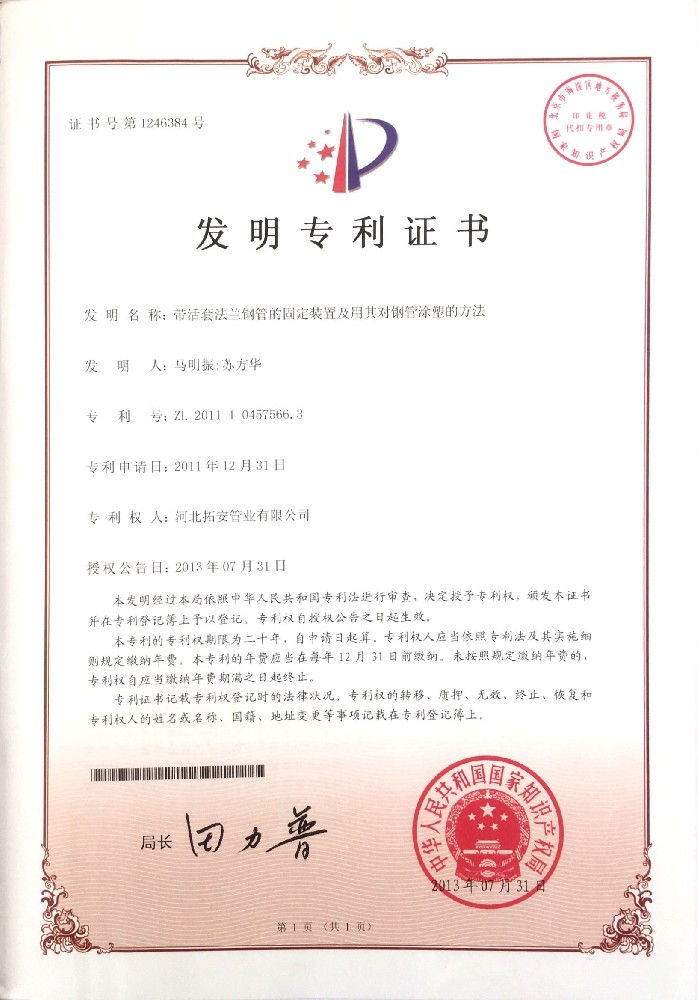 帶活套法蘭鋼管的固定裝置及用其對(duì)鋼管涂塑的方法證書(shū)
