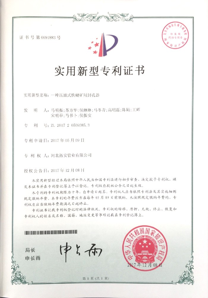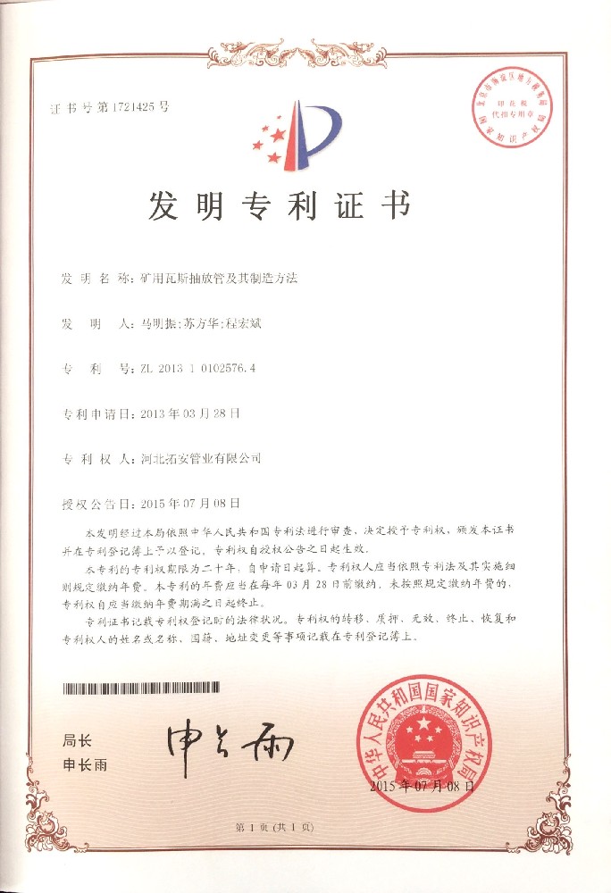 礦用瓦斯抽放管及其制造方法證書(shū)