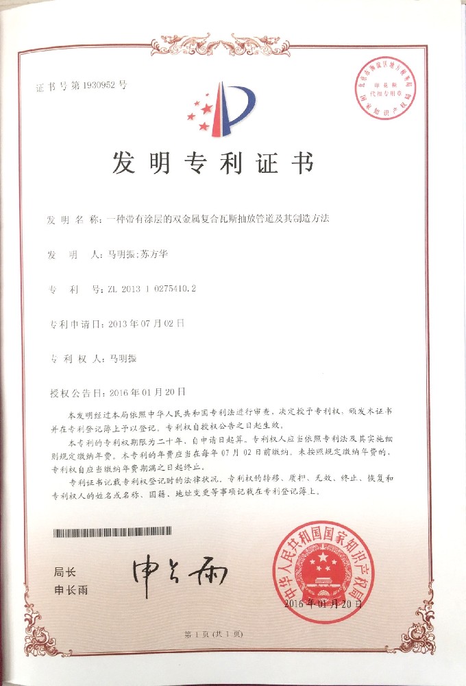 一種帶有涂層的雙金屬?gòu)?fù)合瓦斯抽放管道及其制造方法證書(shū)
