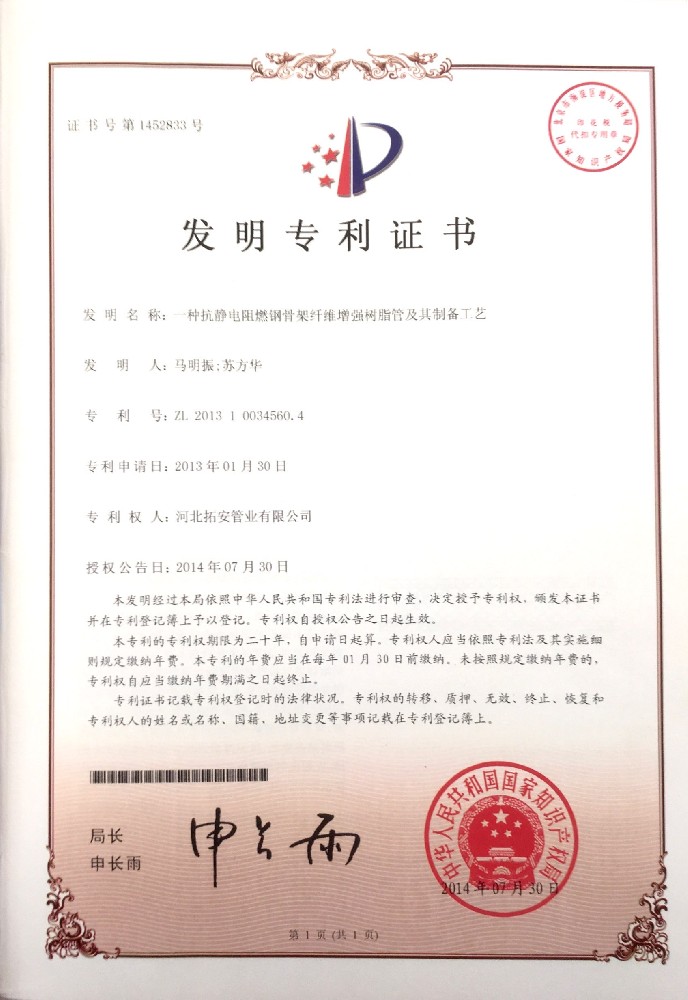 一種抗靜電阻燃鋼骨架纖維增強(qiáng)樹(shù)脂管及其制備工藝證書(shū)