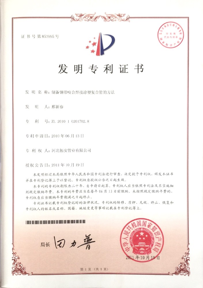 制備鋼帶咬合焊接涂塑復(fù)合管的方法證書(shū)